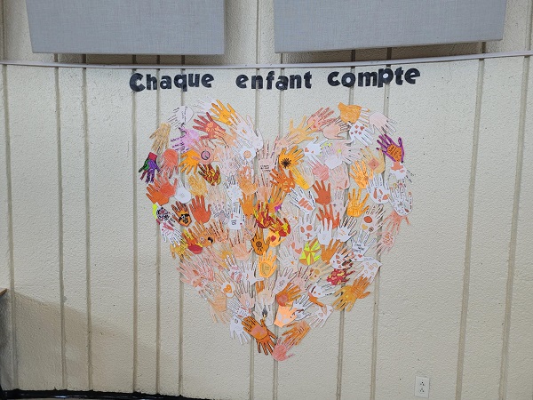 Les élèves de 9e ont créé une oeuvre collective en découpant l'empreinte de leur main et en y inscrivant le nom d'enfants autochtones décédés dans les pensionnats. Les élèves de 10e année ont affiché des petits chandails orange dans l'école pour nous rappeler l'importance de cette journée.